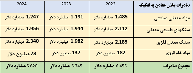 مجموع صادرات ترکیه در سال 2024 بالغ 237.504 میلیارد دلار بوده است که سهم صادرات بخش معدن از کل صادرات این کشور  2.3 درصد  معادل 5.620 میلیارد دلار بوده که نسبت به سال 2023 کاهش داشته است.