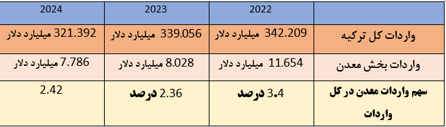 بر اساس اعلام سازمان آمار ترکیه، واردات بخش معدن که سهم ۲.۴۲ درصدی از کل واردات این کشور را تشکیل می‌دهد، در مقایسه با سال ۲۰۲۳ با ۳.۰۲ درصد کاهش به ۷,۷۸۶ میلیارد دلار رسیده است.