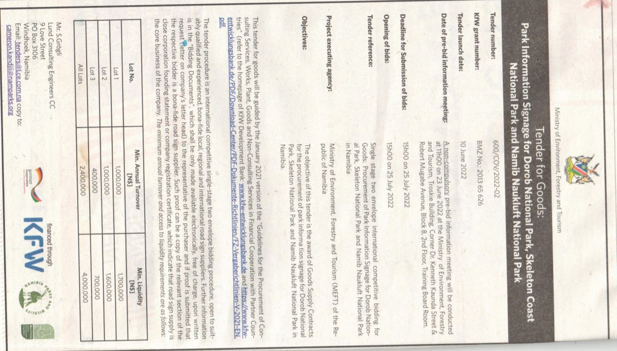Tender for goods: Procurement of Park Information Signage for Dorob National Park Skeleton National Park and Namib Naukluft National Park in Namibia.