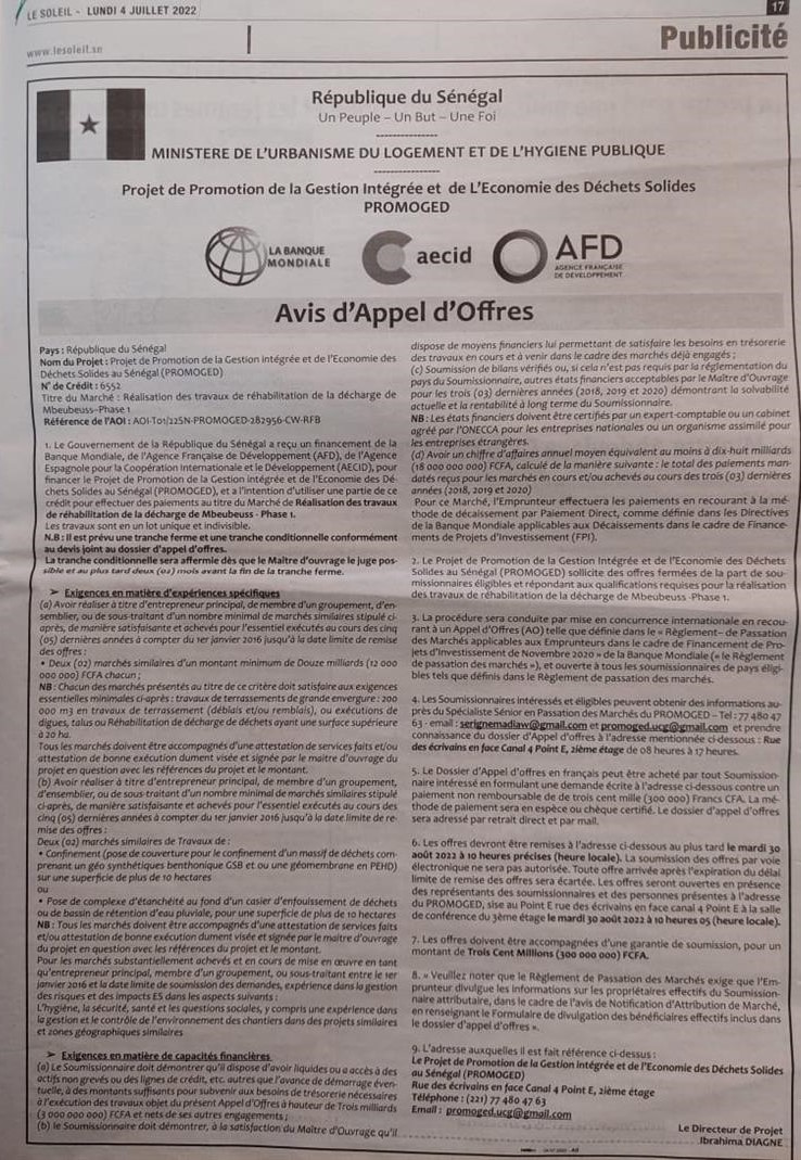 سنگال- ارتقای مدیریت یکپارچه و اقتصاد زباله های جامد